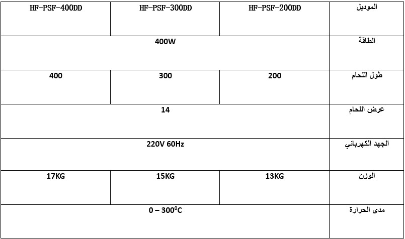 - الموديل HF-PSF-300DD: قدرة 300 واط، طول لحام 300 ملم، وزن 15 كيلوجرام.